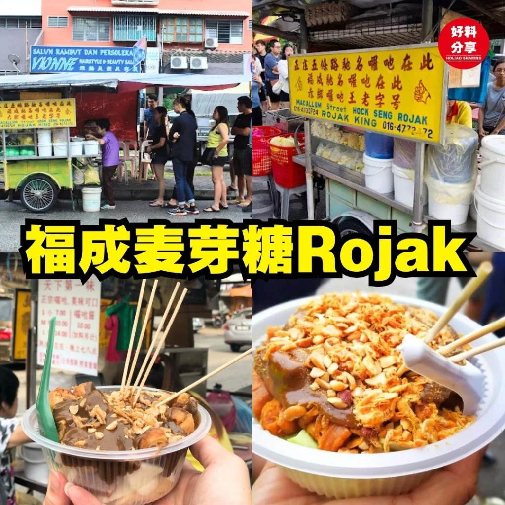 想找点特别的下午茶?福成麦芽糖Rojak绝对是槟城在地美食合集中的黑马。不同于一般的虾膏酱,他们加入了麦芽糖,使得酱汁更加浓稠粘郁,且带着淡淡的清甜。裹满酱汁的水果脆口清新,洒上厚厚的花生碎,嚼起来那叫一个香!