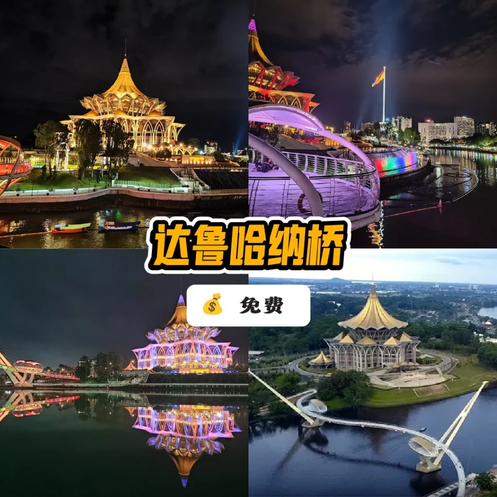 Darul Hana大桥是古晋最浪漫的夜景打卡点。桥上有音乐喷泉,河畔夜景迷人,情侣和朋友们可以在这里散步、拍照,感受夜晚的浪漫氛围。这里不仅是拍照圣地,也是享受古晋夜晚宁静与浪漫的绝佳选择。