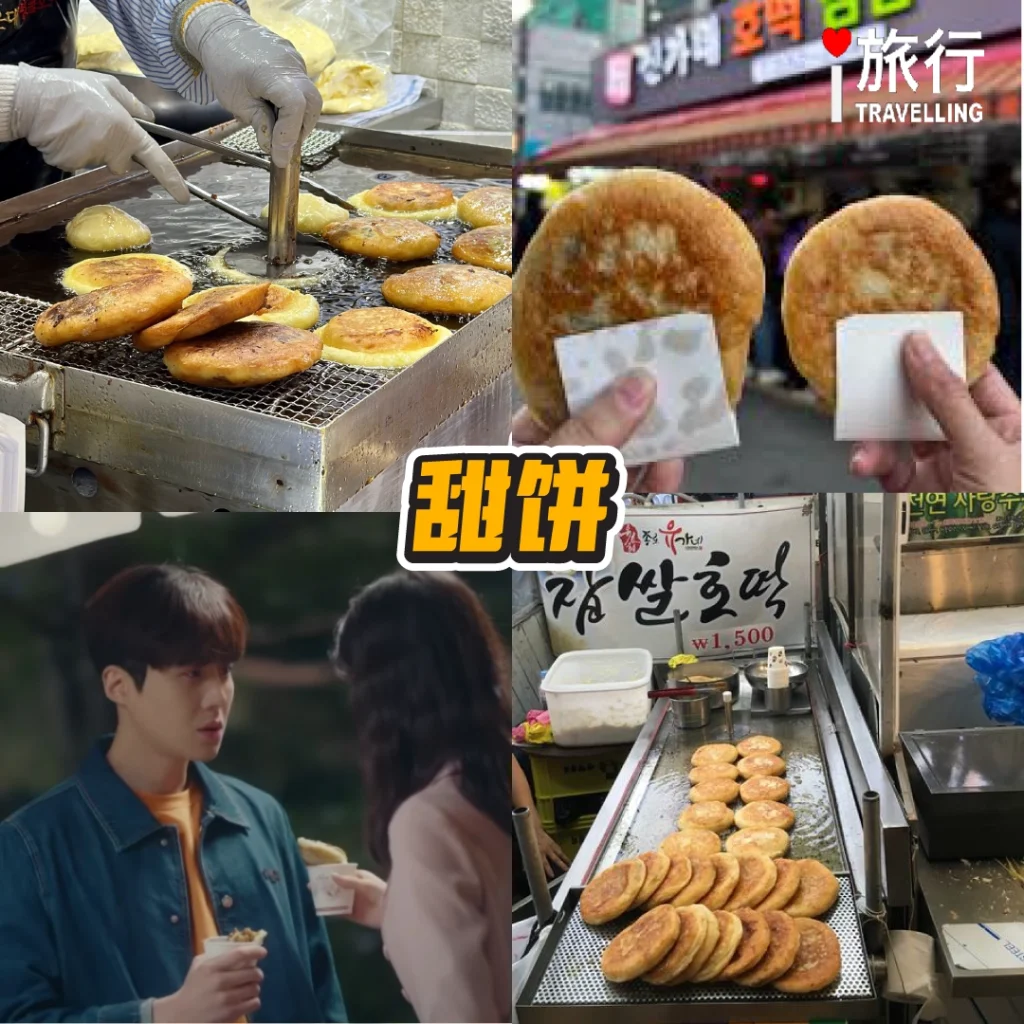 如果你在冬天来到韩国,一定要尝试甜饼。外皮煎得金黄酥脆,里面包着黑糖、坚果和桂皮粉,咬下去的时候,热乎乎的糖浆流出来,甜蜜到让人幸福爆棚。甜饼的香气在街头弥漫,光是闻到味道就会忍不住排队。吃的时候要小心,因为馅料真的很烫,但正是这种“被烫到也愿意”的甜蜜,让甜饼成为韩国冬天最受欢迎的街头小吃之一。
