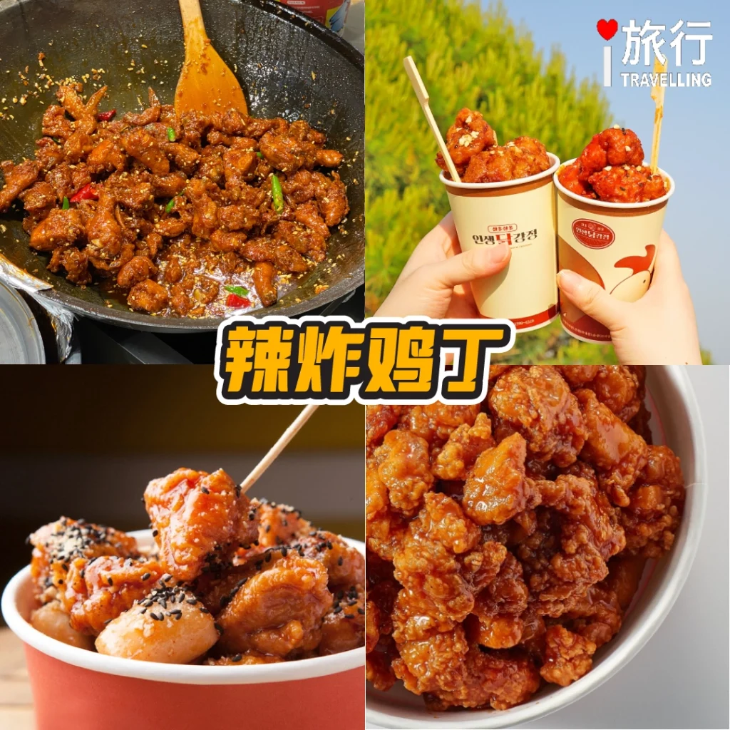 韩国人对炸鸡的热爱无人能敌,而街边摊档的辣炸鸡丁就是小份量的快乐代表。外酥里嫩的鸡肉块裹着甜辣酱汁,入口酥脆,随后辣味和甜味在口腔里交织,令人欲罢不能。很多摊档还会撒上芝麻或花生碎,增加香气和口感。点一份小吃装的辣炸鸡丁,边走边吃,或者配上一杯冰啤酒,立刻就能感受到韩剧里那种“炸鸡啤酒”的浪漫氛围。