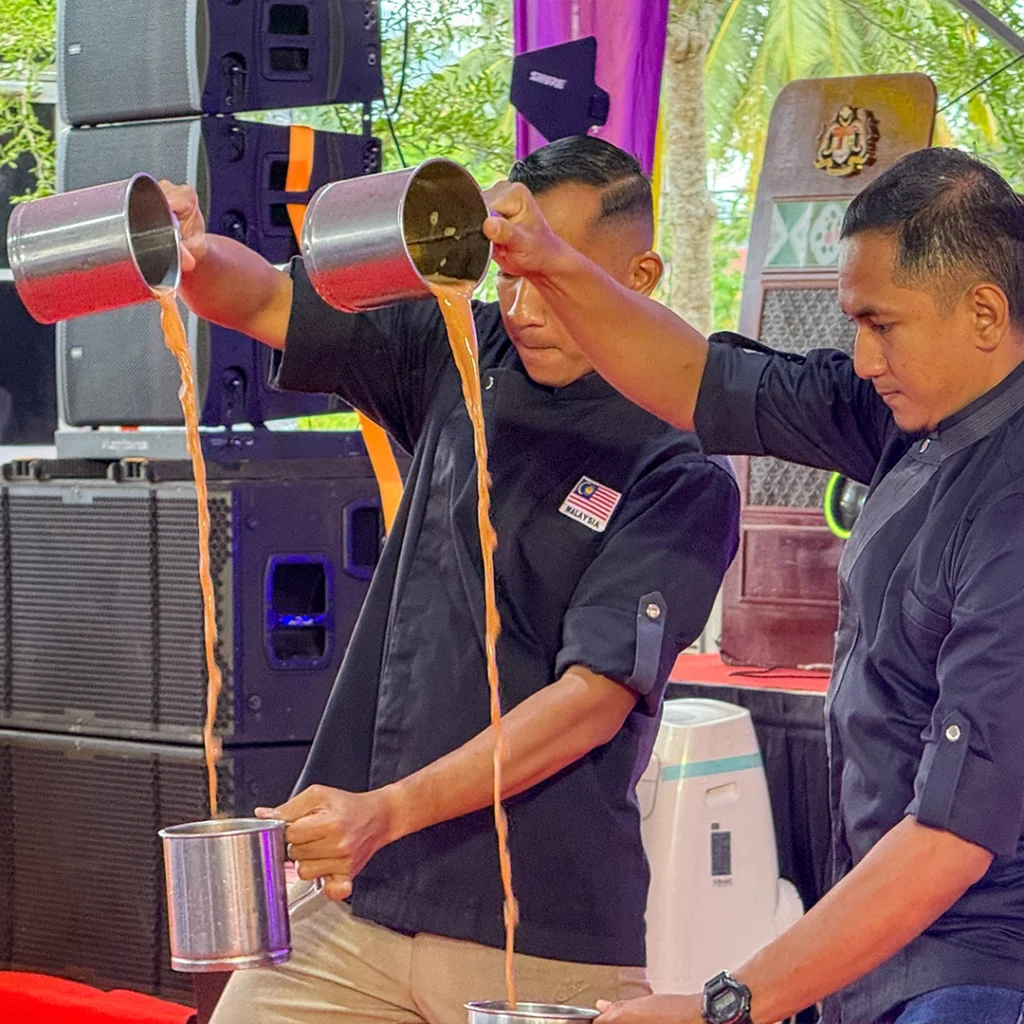 ☕ Roti Canai Terbang 与 Teh Tarik 表演 —— 结合趣味与技巧,吸引众多师生驻足观看。